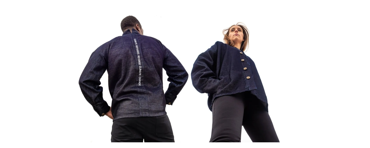 SXD X CLIMATE REFUGEES 夾克,Shelly Xu Design 設計,採用深藍色原生丹寧布料回收再造。版權:Shelly Xu 零廢棄製版並非美學層面的妥協,而是設計流程的煥發。其依托技術實現,並建立在對材質特性、裁剪製程與規模化生產的深刻理解之上。企業家兼科技創新者 Shelly Xu 正是該領域的專家!