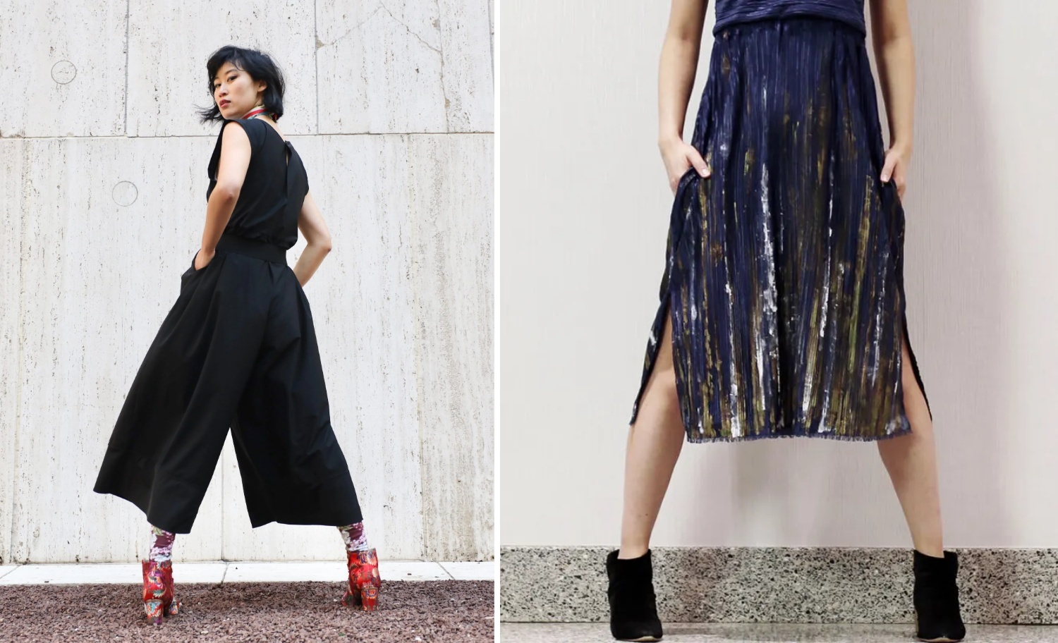 上方圖(由左至右):零廢棄連身褲與褶皺半裙,採用輕盈再生布料製成。版權: Shelly Xu Design
